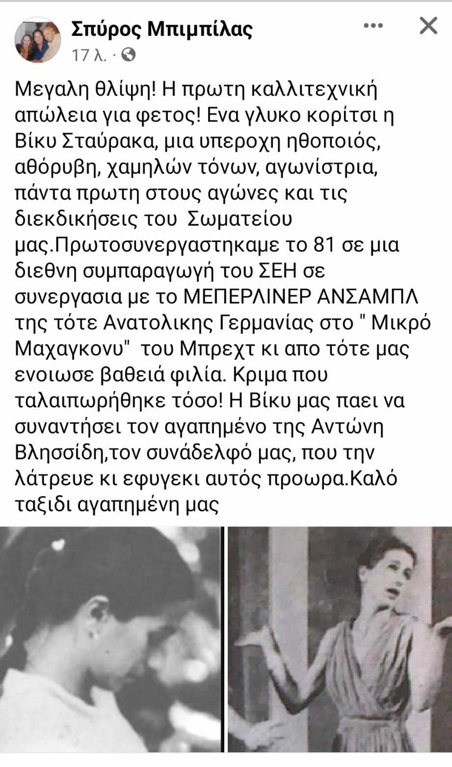 “Ένα γλυκό κορίτσι η Βίκυ Σταύρακα, μια υπεροχη ηθοποιός, αθόρυβη, χαμηλών τόνων, αγωνίστρια, πάντα πρώτη στους αγώνες και τις διεκδικήσεις του Σωματείου μας. Πρωτοσυνεργαστήκαμε το 81 σε μια διεθνη συμπαραγωγή του ΣΕΗ σε συνεργασία με το ΜΕΠΕΡΛΙΝΕΡ ΑΝΣΑΜΠΛ της τότε Ανατολικης Γερμανίας στο ” Μικρό Μαχαγκονυ” του Μπρεχτ κι απο τότε μας ενοιωσε βαθειά φιλία. Κριμα που ταλαιπωρήθηκε τόσο! Η Βίκυ μας παει να συναντήσει τον αγαπημένο της Αντώνη Βλησσίδη,τον συνάδελφό μας, που την λάτρευε κι εφυγεκι αυτός προωρα. Καλό ταξιδι αγαπημένη μας” έγραψε πρίν απο λίγο ο Σπύρος Μπιμπίλας…