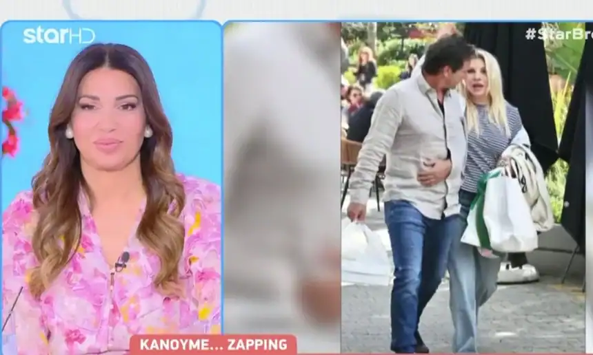 Ο φακός εστίασε στις αγκαλιές του ζευγαριού που δείχνει να διανύει μία πολύ όμορφη περίοδο, ενώ κανείς δεν θα μπορούσε να μην δώσει σημασία στο μπαταρισμένο χέρι του Μάκη Παντζόπουλου που ήταν σε νάρθηκα.