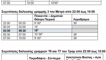 - Γραμμή 1 Μετρό: Δρομολόγια ανά 12,5′ μεταξύ 6:00 – 23:00, ανά 15′ τις υπόλοιπες ώρες