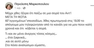 «Μέχρι χθες ήξερα ότι παίζω σε μια σειρά του Αντ1 ΜΕΤΑ ΤΗ ΦΩΤΙΑ 60″ εγγυημένων” επεισοδίων. Χθες πρωτομηνιά στις 18.00 το απόγευμα μου τηλεφώνησαν από το κανάλι για να μου πουν καλή χρονιά και ότι κόβεται η σειρά. Τι και αν μένει άνεργος τόσος κόσμος… έτσι ξαφνικά… .και σε αυτό μένω Στο πόσο αναλώσιμοι είμαστε..” έγραψε η ηθοποιός που υποδύθηκε τον ρόλο της Φαίδρας στη σειρά.