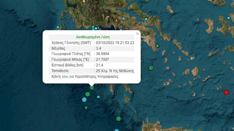 - Ειδικότερα, σύμφωνα με το Γεωδυναμικό Ινστιτούτο Αθηνών, το επίκεντρο του σεισμού εντοπίστηκε 25 χιλιόμετρα Νότια της Μεθώνης και είχε εστιακό βάθος 21,4 χιλιομέτρων.