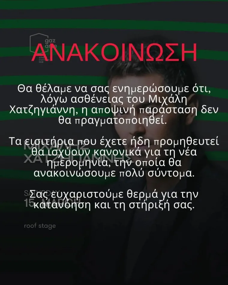 «Θα θέλαμε να σας ενημερώσουμε ότι, λόγω ασθένειας του Μιχάλη Χατζηγιάννη, η αποψινή παράσταση δεν θα πραγματοποιηθεί. Τα εισιτήρια που έχετε ήδη προμηθευτεί θα ισχύουν κανονικά για νέα ημερομηνία, την οποία θα ανακοινώσουμε σύντομα. Σας ευχαριστούμε θερμά για την κατανόηση και τη στήριξή σας» αναφέρει χαρακτηριστικά η σχετική ανακοίνωση.