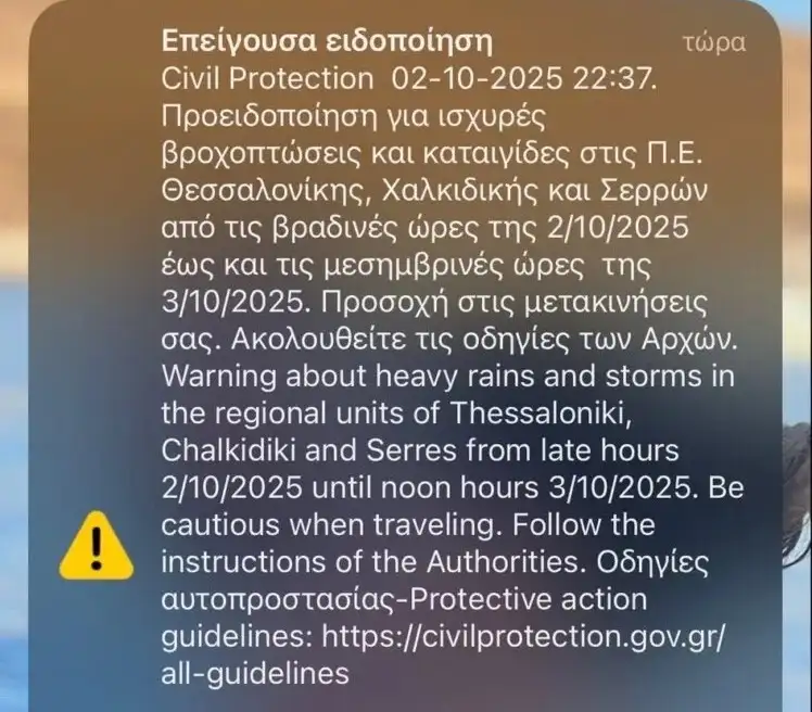 «Προσοχή στις μετακινήσεις σας. Ακολουθείτε τις οδηγίες των Αρχών», τονίζεται στο μήνυμα από την Πολιτική Προστασία.