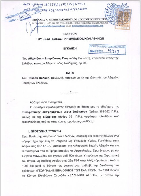- Συγκεκριμένα, σε ανάρτηση του, ο κ. Γεωργιάδης αναφέρει: «Οπως είχα προαναγγείλει σήμερα κατέθεσα τη μήνυση κατά του @pavpol2222 και ακολουθεί και η Αγωγή. Εδειξα υπερβολική ανοχή στις συκοφαντίες και στη συνεχόμενη λάσπη από τον συγκεκριμένο. Θα έρθει λοιπόν στο Δικαστήριο και θα λογοδοτήσει και για τις εναντίον μου και για τις εναντίον των εισαγγελέων που με αρχειοθέτησαν κατηγορίες. Ελπίζω να μη ζητήσει να κρυφτεί πίσω από τη βουλευτική του ασυλία. Νέα μήνυση και αγωγή θα καταθέτω πλέον κάθε φορά που κάποιος αμφισβητεί την ηθική μου συγκρότηση».