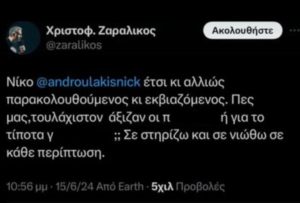Ο ίδιος αναφέρει πως η μήνυση αφορά στο περιεχόμενο της σάτιράς του στο YouTube. Πηγές από το ΠΑΣΟΚ αναφέρουν πως ο Νίκος Ανδρουλάκης μηνύει τον κωμικό λόγω υβριστικής ανάρτησής του στο X (Twitter) τον περασμένο Ιούνιο – μία ανάρτηση που σήμερα έχει «κατέβει». Η ανάρτηση του Χριστόφορου Ζαραλίκου:«Σε ποια χώρα αρχηγός κόμματος κόμματος κάνει μήνυση σε ηθοποιό που κάνει σάτιρα, ενώ δεν κινήθηκε δικαστικά εναντίον αυτών που τον…”