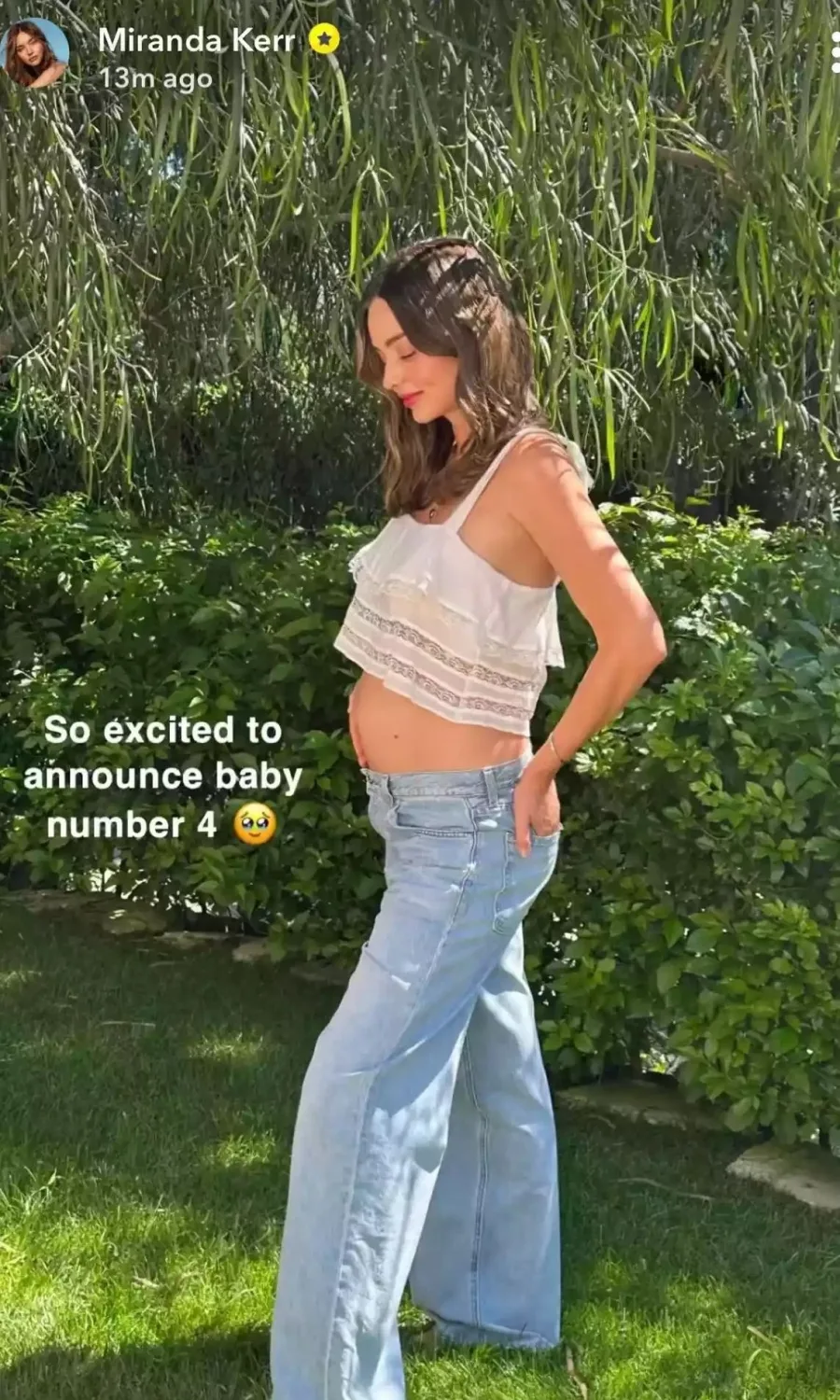 Η Miranda Kerr είναι έγκυος στο τέταρτο παιδί της και όπως αποκάλυψε περιμένει αγόρι.Η επιχειρηματίας και μοντέλο έκανε γνωστή την είδηση της εγκυμοσύνης στα social media και συγκεκριμένα στο Snapchat.Στα στιγμιότυπα που δημοσίευσε πόζαρε φορώντας τζιν παντελόνι και ένα λευκό τοπ που άφηνε ακάλυπτη τη φουσκωμένη της κοιλίτσα.