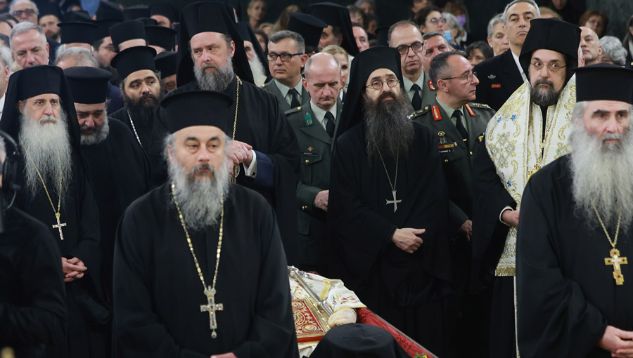 Μέλη της κυβέρνησης, της Βουλής, αγήματα του στρατού και απλοί πολίτες βρίσκονται στο ναό, όπου η Θεσσαλονίκη αποχαιρετά τον Μητροπολίτη.