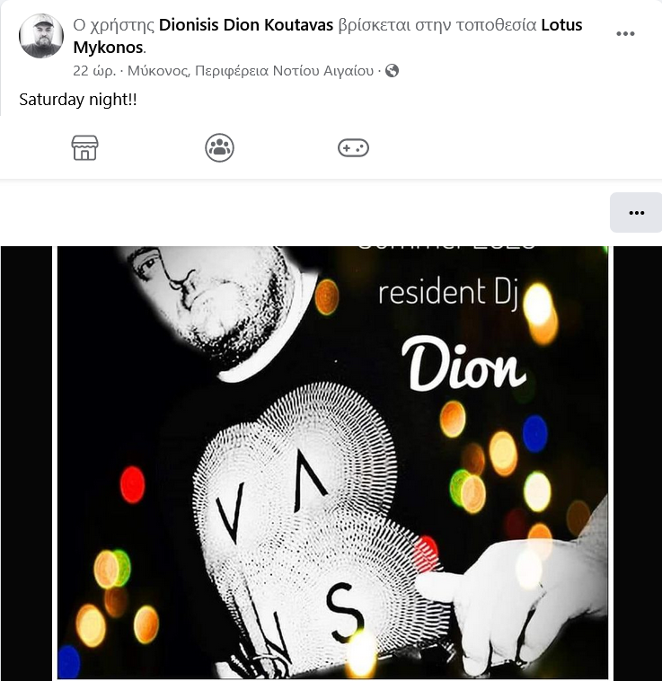 Εντελώς ξαφνικά άφησε χθες την τελευταία του πνοή στη Μύκονο ο γνωστός Dj Dion (Διονύσης Κουτουβάς) που έπαιζε μουσική σε δημοφιλές μπαρ στα Ματογιάννια.