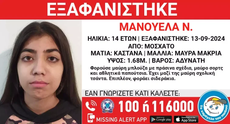 Όπως ανακοίνωσε το «Χαμόγελο του Παιδιού» για την εξαφάνιση, τα ίχνη της 14χρονης Μανουέλας Ν. χάθηκαν βραδινές ώρες της Παρασκευής 13 Σεπτεμβρίου από χώρο παιδικής προστασίας στο Μοσχάτο.