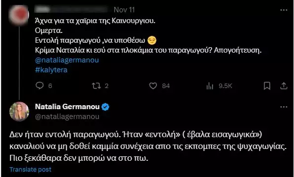 Πιο συγκεκριμένα, χρήστης του twitter ρώτησε τη Ναταλία Γερμανού: «Άχνα για τα χαΐρια της Καινούργιου. Εντολή παραγωγού να υποθέσω. Κρίμα Ναταλία. Κι εσύ στα πλοκάμια του παραγωγού; Απογοήτευση».