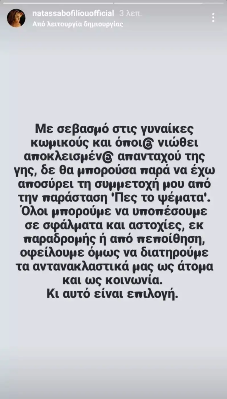 «Με σεβασμό στις γυναίκες κωμικούς και όποιο@ νιώθει αποκλεισμέν@ απανταχού της γης, δε θα μπορούσα παρά να έχω αποσύρει τη συμμετοχή μου από την παράσταση «Πες το ψέματα». Όλοι μπορούμε να υποπέσουμε σε σφάλματα και αστοχίες, εκ παραδρομής ή από πεποίθηση, οφείλουμε όμως να διατηρούμε τα αντανακλαστικά μας ως άτομα και ως κοινωνία. Κι αυτό είναι επιλογή», έγραψε χαρακτηριστικά η Νατάσα Μποφίλιου σε Insta-story.