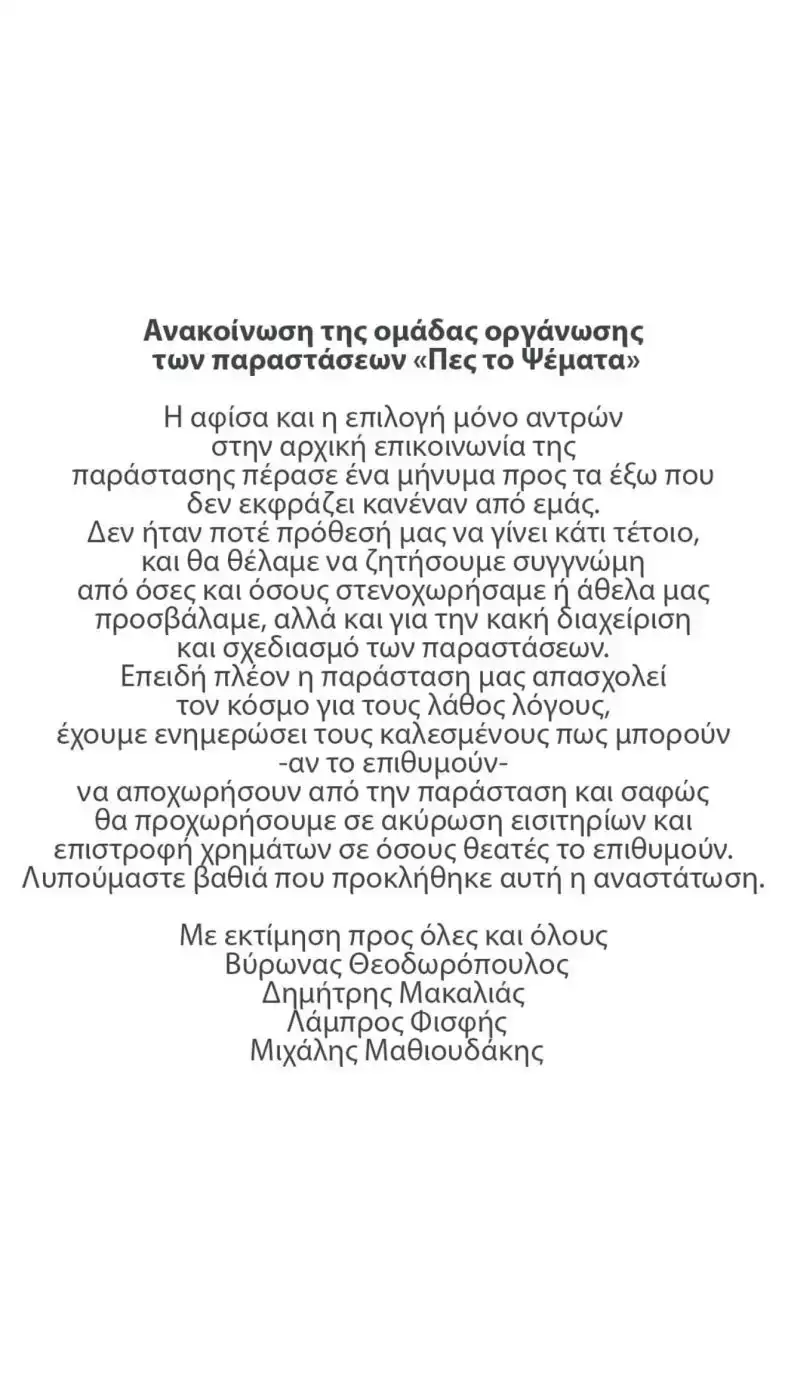Επειδή πλέον η παράστασή μας απασχολεί τον κόσμο για τους λάθος λόγους, έχουμε ενημερώσει τους καλεσμένους πως μπορούν -αν το επιθυμούν- να αποχωρήσουν από την παράσταση και σαφώς θα προχωρήσουμε σε ακύρωση εισιτηρίων και επιστροφή χρημάτων σε όσους θεατές το επιθυμούν».