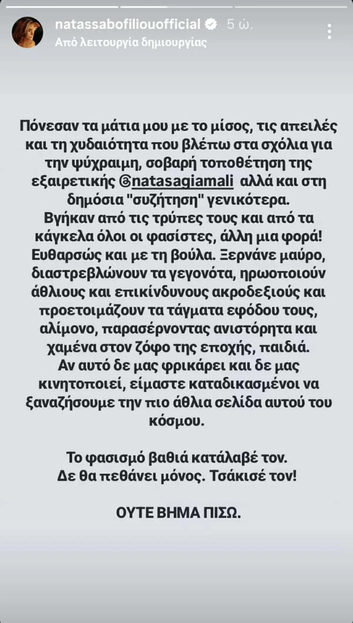 «Αν αυτό δε μας φρικάρει και δε μας κινητοποιεί, είμαστε καταδικασμένοι να ξαναζήσουμε την πιο άθλια σελίδα αυτού του κόσμου. Το φασισμό βαθιά κατάλαβέ τον. Δε θα πεθάνει μόνος. Τσάκισέ τον! ΟΥΤΕ ΒΗΜΑ ΠΙΣΩ», καταλήγει στο αυστηρό της μήνυμα η Νατάσα Μποφίλιου.