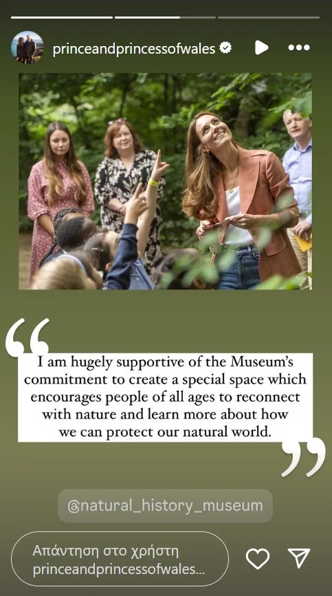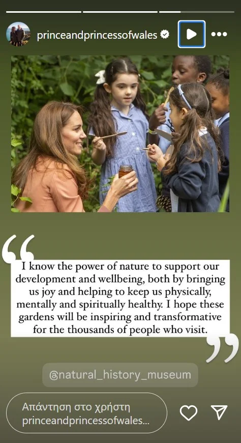 Τα λόγια της Κέιτ εμφανίστηκαν σε μια σειρά από stories στην επίσημη σελίδα της στο Instagram, όπου εξέφρασε την υποστήριξή της στα εγκαίνια των νέων κήπων του Μουσείου Φυσικής Ιστορίας.