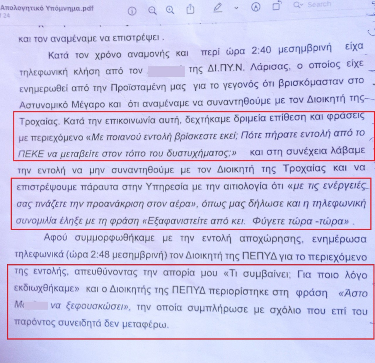 Όμως εξαιρετικά ενδιαφέρον είναι τι ανέφερε στο υπόμνημα του ένας εκ των ελεγχόμενων ερευνητών της Πυροσβεστικής, που σημείωνε «κατά τον χρόνο της αναμονής στο αστυνομικό μέγαρο της Λάρισας είχα τηλεφωνική κλήση από υψηλόβαθμο στέλεχος (σσ τον προσδιορίζει) της Διοίκησης Πυροσβεστικών Υπηρεσιών Λάρισας (ΔΙΠΥΝ) ο οποίος είχε ενημερωθεί από την προϊσταμένη μας για το γεγονός ότι βρισκόμασταν στο Αστυνομικό Μέγαρο και ότι αναμέναμε να συναντηθούμε με τον Διοικητή της Τροχαίας.»