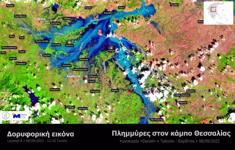 Τα δορυφορικά δεδομένα δείχνουν σε υψηλή ανάλυση τις πρωτοφανείς πλημμύρες στις περιοχές στον Θεσσαλικό Κάμπο (με γαλάζιο χρώμα), όπως τα ανέλυσε το Εθνικό Αστεροσκοπείο Αθηνών/meteo. Η μονάδα meteo πραγματοποίησε την οπτικοποίηση των πλημμυρισμένων εκτάσεων.Δορυφορική εικόνα των πλημμυρισμένων εκτάσεων στην περιοχή της Λάρισας το πρωί της Παρασκευής 08/09/2023, μέσω του δορυφόρου Landsat-8.