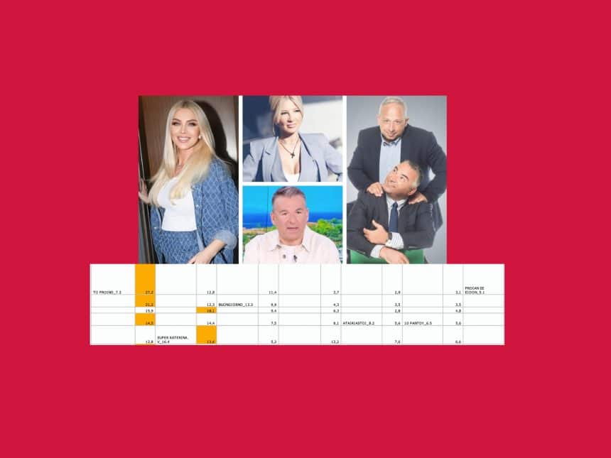 Την ίδια στιγμή ο ανταγωνισμός κινείται σε εντελώς διαφορετικά επίπεδα. Η Κατερίνα Καινούργιου στον Alpha TV σαρώνει με 16,4%, ενώ η Φαίη Σκορδά στο Mega Channel ακολουθεί με 13,3%, εκμεταλλευόμενη και τη συνολική άνοδο του σταθμού στα ψυχαγωγικά.