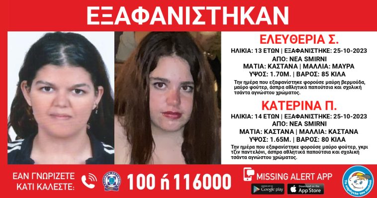 Συναγερμός σήμανε στις Αρχές για την εξαφάνιση της 13χρονης Ελευθερίας Σ. και της 14χρονης Αικατερίνης Π. από τη Μονάδα Κοινωνικής Φροντίδας Παιδόπολη «Αγία Βαρβάρα», στην περιοχή της Νέας Σμύρνης.Σύμφωνα με ανακοίνωση από το «Χαμόγελο του Παιδιού», την Τετάρτη 25 Οκτωβρίου 2023, μεσημεριανές ώρες, εξαφανίστηκαν από την Παιδόπολη στην περιοχή της Νέας Σμύρνης, η Κατερίνα Π., 14 ετών και η Ελευθερία Σ.,13 ετών.