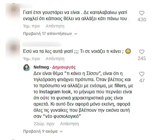 Σε σχόλια follower, η Νεφέλη Μεγκ απάντησε: «Δεν είναι θέμα “τι κάνει η Σίσσυ”, είναι ότι η τηλεόραση φτιάχνει πρότυπα. Όταν βλέπεις και το πρόσωπο να αλλάζει με ενέσιμα, με fillers, με το Instagram look, το μήνυμα που περνάει είναι ότι ούτε τα φυσικά χαρακτηριστικά μας είναι αρκετά. Κι αυτό δεν αφορά μόνο εκείνη, αφορά όλες τις γυναίκες που βλέπουν την εικόνα αυτή σαν “νέο φυσιολογικό”».
