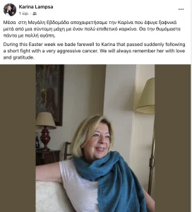 Η είδηση του θανάτου της έγινε γνωστή με ανάρτηση στον προσωπικό της λογαριασμό στο Facebook.