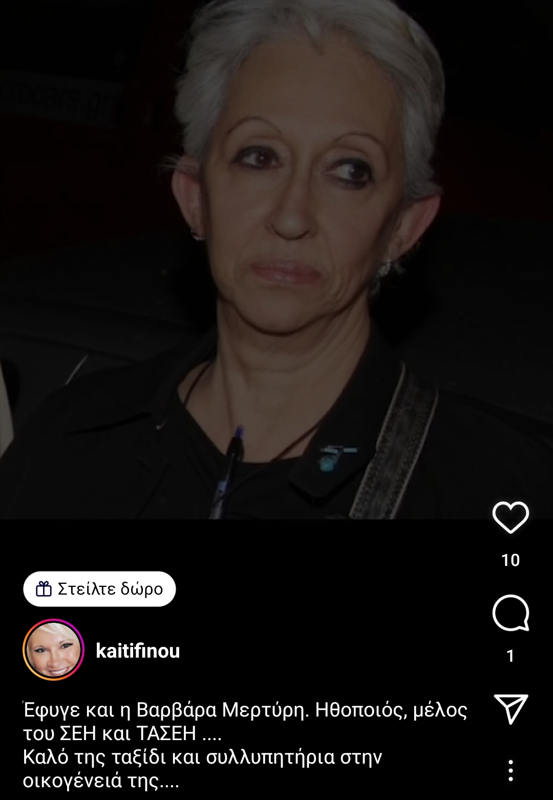 Η ηθοποιός Βαρβάρα Μερτύρη έφυγε από τη ζωή και τη δυσάρεστη είδηση έκανε γνωστή η Καίτη Φίνου.