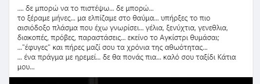 - «δε μπορώ να το πιστέψω… δε μπορώ…το ξέραμε μήνες… μα ελπίζαμε στο θαύμα… υπήρξες το πιο αισιόδοξο πλάσμα που έχω γνωρίσει… γέλια, ξενύχτια, γενεθλια, διακοπές, πρόβες, παραστάσεις… εκείνο το Αγκίστρι θυμάσαι; …”έφυγες” και πήρες μαζί σου τα χρόνια της αθωότητας…… ένα πράγμα με ηρεμεί… δε θα πονάς πια… καλό σου ταξίδι Κάτια μου…»