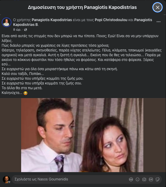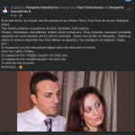 Την θλιβερή είδηση της απώλειάς της έκανε γνωστή ο ίδιος ο ηθοποιός, εμφανώς συγκλονισμένος, μέσα από ανάρτηση του στο Facebook.