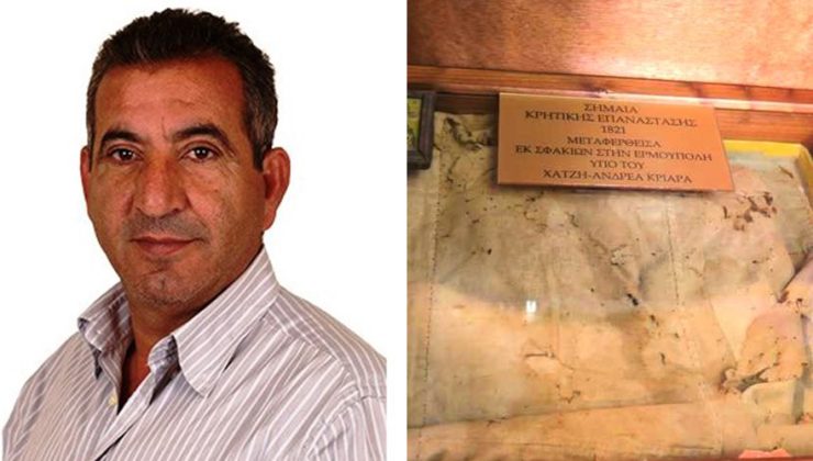 «Δεν ξεχνούμε ότι πρωτοστάτησε στον εντοπισμό, τη διαφύλαξη και την ανάδειξη της σφακιανής σημαίας του 1821, που είχε διασώσει ο Χατζη – Ανδρέας Κριαράς, στην Ερμούπολη, και έχουν παραχωρήσει οι απόγονοί του στην Αρχιεπισκοπή Κρήτης, για να συντηρηθεί.»