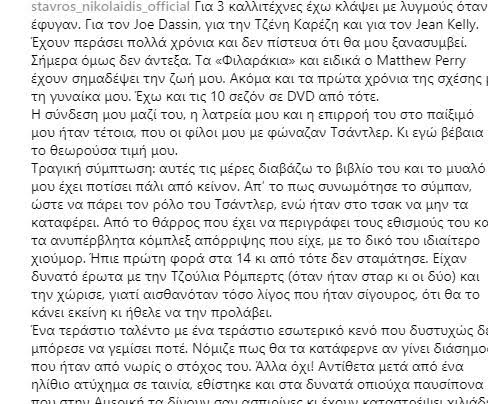 Με μια φωτογραφία του διάσημου ηθοποιού και ένα μεγάλο κείμενο, ο Σταύρος Νικολαίδης εξηγεί γιατί έκλαψε με λυγμούς στην είδηση του θανάτου του και πόσο ο Matthew Perry έχει σημαδέψει τη ζωή του.