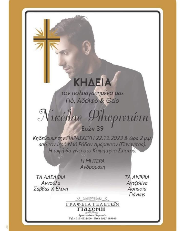 Την Παρασκευή θα γίνει η κηδεία του Νίκου Φλωρινιώτη, του 39χρονου γιου του Γιάννη Φλωρινιώτη που πέθανε σήμερα έπειτα από μάχη με τον καρκίνο.