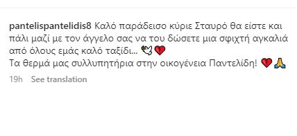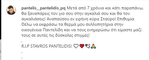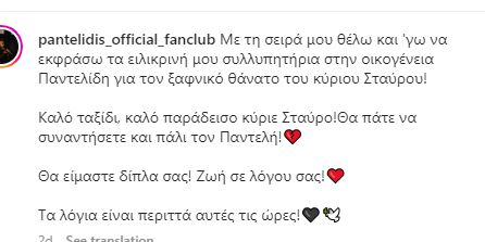 - Οι φίλοι και θαυμαστές του Παντελή Παντελίδη, αλλά και του Κωνσταντίου που ακολουθεί τα χνάρια του αδερφού του στο τραγούδι, με συγκινητικά ποστ εύχονται συλλυπητήρια στην οικογένεια ενώ γράφουν πως «Μετά από 7 χρόνια και κάτι παραπάνω, θα ξαναπάρεις τον γιο σου στην αγκαλιά σου και θα τον αγκαλιάσεις! Αναπαύσου εν ειρήνη κύριε Σταύρο!»