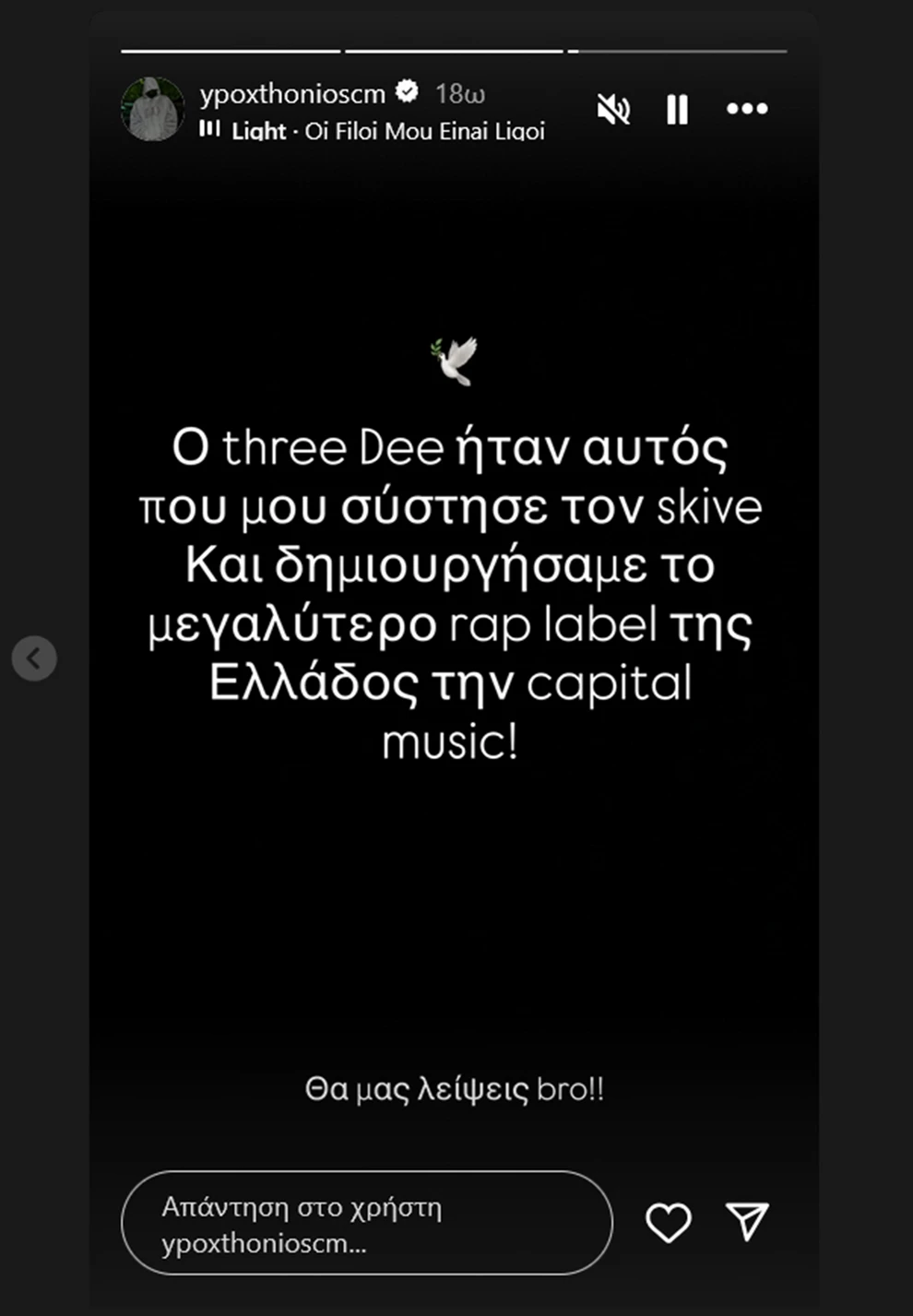 Ένας από τους πιο χαρακτηριστικούς εκπροσώπους της ραπ σκηνής της Θεσσαλονίκης, ο ράπερ 3D (γνωστός και ως Τρισδιάστατος ή Three Dee), έφυγε από τη ζωή σε ηλικία 41 ετών.