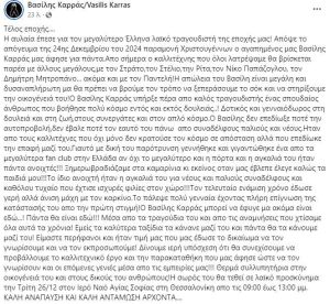 «Τέλος εποχής…. Η αυλαία έπεσε για τον μεγαλύτερο Έλληνα λαϊκό τραγουδιστή της εποχής μας! Απόψε το απόγευμα της 24ης Δεκεμβρίου του 2024 παραμονή Χριστουγέννων ο αγαπημένος μας Βασίλης Καρράς μας άφησε για πάντα. Απο σήμερα ο καλλιτέχνης που όλοι λατρέψαμε θα βρίσκεται παρέα με άλλους μεγάλους, με τον Στράτο,τον Στέλιο,την Ρίτα,τον Νίκο Παπάζογλου, τον Δημήτρη Μητροπάνο… ακόμα και με τον Παντελή!Η απώλεια του Βασίλη είναι μεγάλη και δυσαναπλήρωτη μα θα πρέπει να βρούμε τον τρόπο να ξεπεράσουμε το σόκ και να στηρίξουμε την οικογένειά του!Ο Βασίλης Καρράς υπήρξε πέρα απο καλός τραγουδιστής ένας σπουδαίος άνθρωπος που βοήθησε πολύ κόσμο εντός και εκτός δουλειάς..! Δοτικός και γενναιόδωρος στη δουλειά και στη ζωή, στους συνεργάτες και στον απλό κόσμο. Ο Βασίλης δεν επεδίωξε ποτέ την αυτοπροβολή, δεν έβαλε ποτέ τον εαυτό του πάνω απο συναδέλφους παλιούς και νέους. Ηταν απο τους καλλιτέχνες που όχι μόνο δεν κρατούσε τον κόσμο σε απόσταση αλλά που επεδίωκε την επαφή μαζί του. Γι’ αυτό με δική του παρότρυνση γεννήθηκε και γιγαντώθηκε ένα απο τα μεγαλύτερα fan club στην Ελλάδα αν όχι το μεγαλύτερο και η πόρτα και η αγκαλιά του ήταν πάντα ανοιχτές!!! Ξημερωβραδιάζαμε στα καμαρίνια κι εκείνος όταν μας έβλεπε έλεγε καλώς τα παιδιά μου!!!Το ίδιο ανοιχτή ήταν η αγκαλιά του για νέους και παλιούς συναδέλφους και καθόλου τυχαίο που έχτισε ισχυρές φιλίες στον χώρο!!!Τον τελευταίο ενάμιση χρόνο έδωσε γερή αλλά άνιση μάχη με τον καρκίνο. Το πάλεψε πολύ γενναία έχοντας πλήρη επίγνωση της κατάστασής του απο την πρώτη στιγμή!Ο Βασίλης Καρράς μπορεί να έφυγε μα ακόμα είναι εδώ…! Πάντα θα είναι εδώ!!! Μέσα απο τα τραγούδια του και απο τις αναμνήσεις που χτίσαμε όλα αυτά τα χρόνια! Εμείς τα καλύτερα ταξίδια τα κάνανε μαζί του και πάντα θα τα κάνουμε μαζί του! Είμαστε περήφανοι και ήταν τιμή μας που μας έδωσε το δικαίωμα να τον γνωρίσουμε και να τον εκπροσωπούμε! Δίνουμε ιερή υπόσχεση ότι θα συνεχίσουμε να προβάλλουμε το καλλιτεχνικό έργο και την παρακαταθήκη που μας άφησε ώστε να τον γνωρίσουν και οι επόμενες γενιές μέσα απο τις εμπειρίες μας!!! Θερμά συλλυπητήρια στην οικογένειά του και στους δικούς του ανθρώπους! Η σορός του θα τεθεί σε λαϊκό προσκύνημα την Τρίτη 26/12 στον Ιερό Ναό Αγίας Σοφίας στη Θεσσαλονίκη απο τις 09:00 έως 13:00 μμ.»