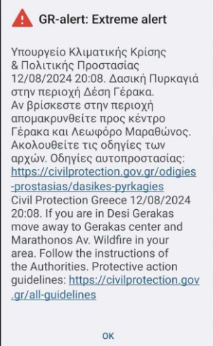 Νέο μήνυμα 112 εστάλη στους κατοίκους Δέσης Γέρακα με τη σύσταση να απομακρυνθούν προς κέντρο Γέρακα και λεωφόρο Μαραθώνος.