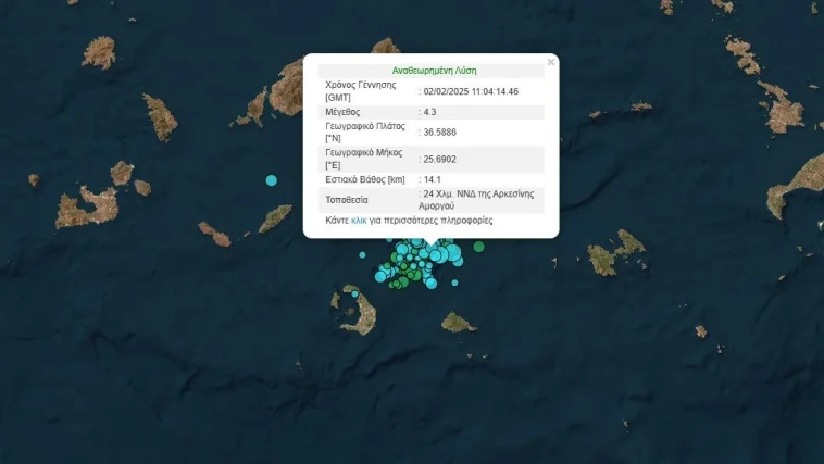 Το εστιακό βάθος του νέου σεισμού που εκδηλώθηκε στις 14.55 μμ εντοπίζεται στα 14.1 χιλιόμετρα και σε απόσταση 19 χιλιομέτρων νότιο – νοτιοδυτικά της Αρκεσίνης Αμοργού.