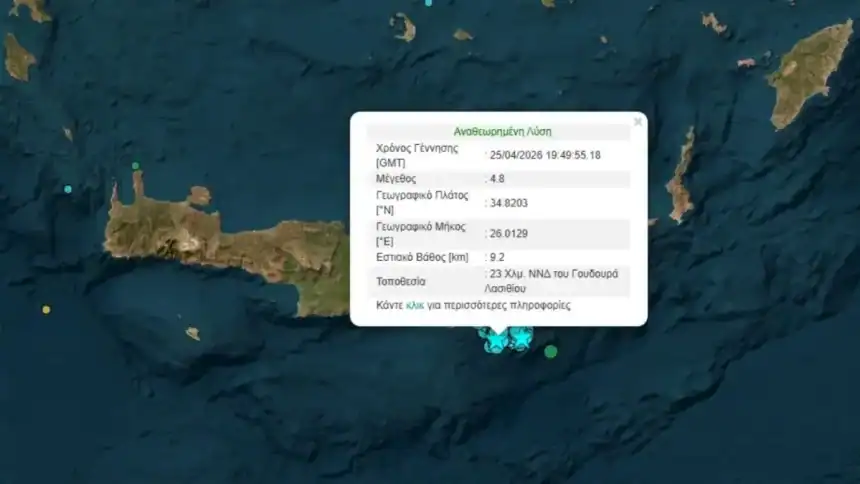 Νέα σεισμική δόνηση ταρακούνησε το Λασίθι το βράδυ του Σαββάτου 25.04.2026, με τον σεισμό να έχει μέγεθος 4,8 βαθμών της κλίμακας Ρίχτερ.