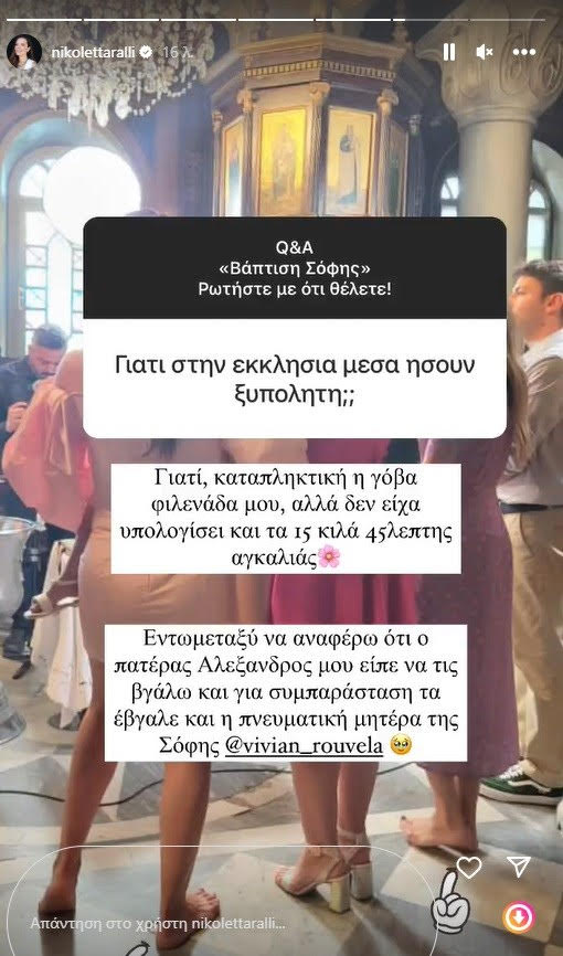 - Μάλιστα, όταν μία follower τη ρώτησε για ποιον λόγο κατά τη διάρκεια της βάφτισης ήταν ξυπόλητη, η ίδια έγραψε:«Γιατί, καταπληκτική η γόβα, αλλά δεν είχα υπολογίσει και τα 15 κιλά 45λεπτης αγκαλιάς.Εντωμεταξύ να αναφέρω ότι ο πατέρας Αλέξανδρος μου είπε να τις βγάλω και για συμπαράσταση τα έβγαλε και η πνευματική μητέρα της Σόφης».