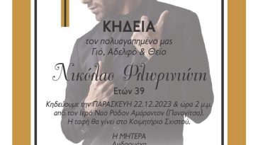Θλίψη σκόρπισε ο θάνατος του Νίκου Φλωρινιώτη, ο οποίος έφυγε από τη ζωή πριν από τρεις μήνες και συγκεκριμένα στις 19 Δεκεμβρίου, έπειτα από μια γενναία μάχη με τον καρκίνο, λίγο διάστημα αφότου είχε πεθάνει και ο πατέρας του, Γιάννης.