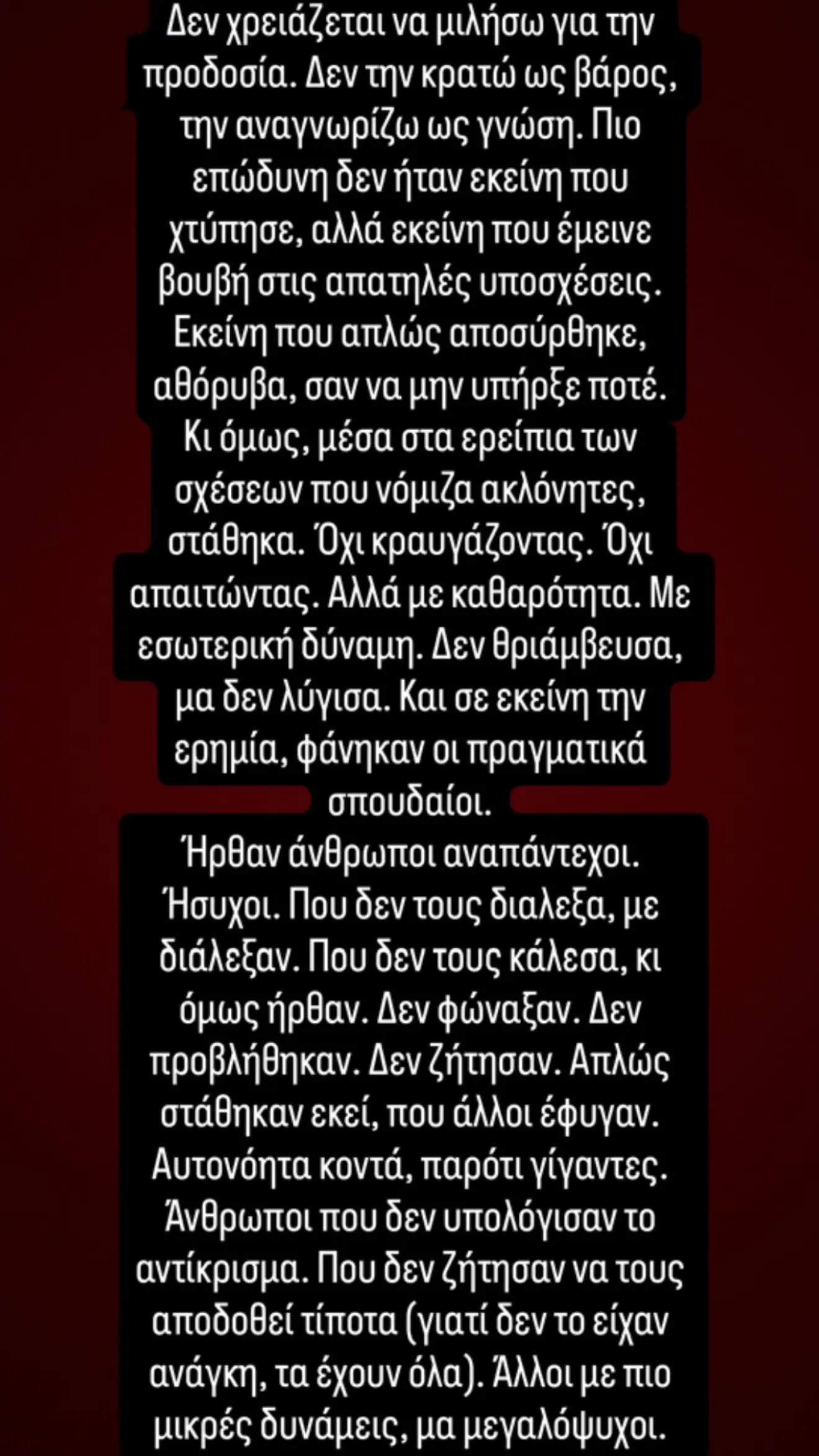 «Ήταν ο καιρός που απογυμνώθηκαν οι ρόλοι, οι συμμαχίες και τα προσωπεία. Που η φιλία μεταμορφώθηκε, σε κάποιες περιπτώσεις, σε στρατηγική και αποστασιοποίηση. Που άνθρωποι που στήριξα, υπερασπίστηκα και τίμησα, προτίμησαν τη σιωπή από τη στήριξη και την απουσία από τη συμπαράσταση. Δεν χρειάζεται να μιλήσω για την προδοσία. Δεν την κρατώ ως βάρος, την αναγνωρίζω ως γνώση. Πιο επώδυνη δεν ήταν εκείνη που χτύπησε, αλλά εκείνη που έμεινε βουβή στις απατηλές υποσχέσεις.