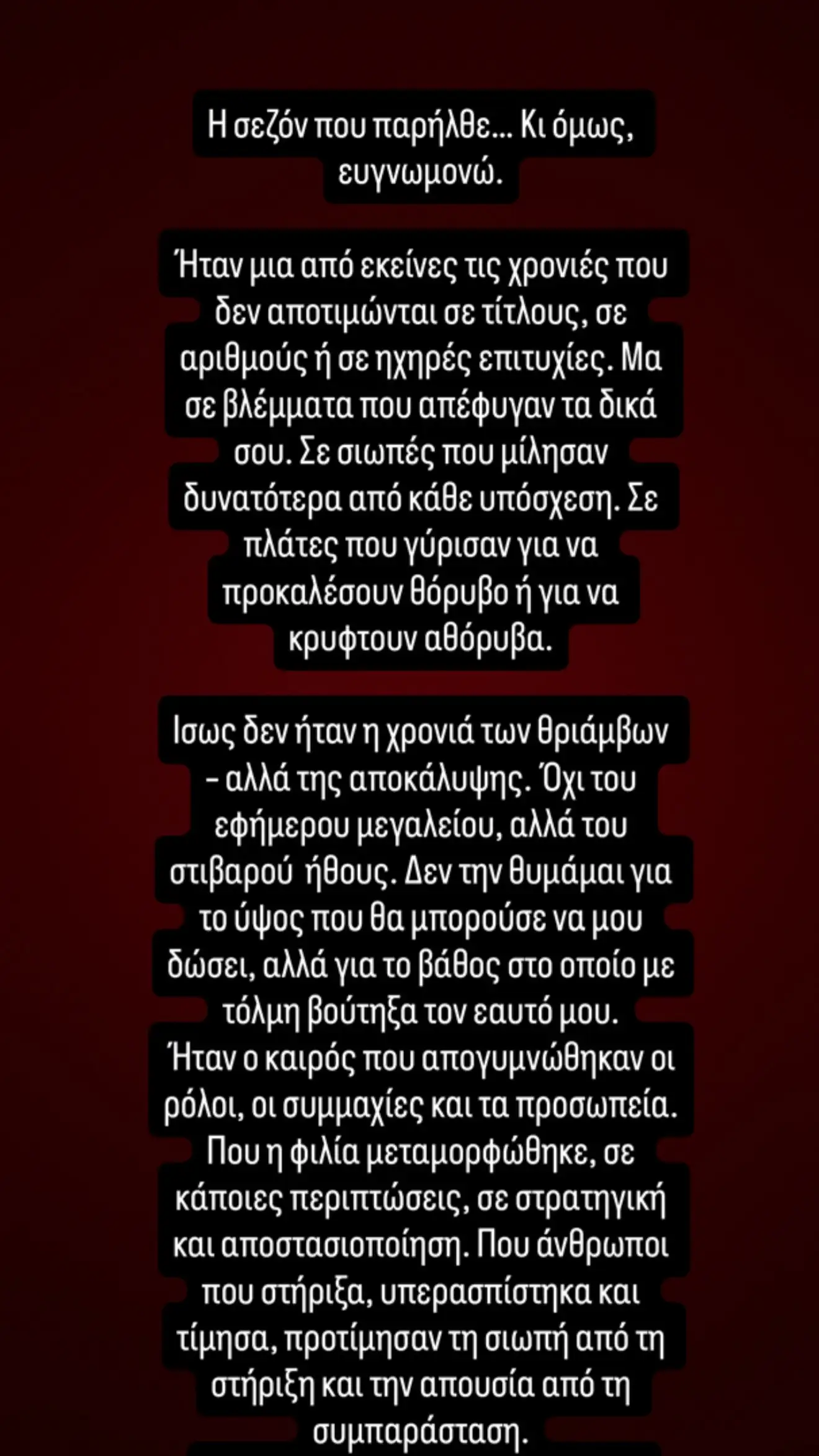 «Ήταν μία από εκείνες τις χρονιές που δεν αποτιμώνται σε τίτλους, σε αριθμούς ή σε ηχηρές επιτυχίες. Μα σε βλέμματα που απέφυγαν τα δικά σου. Σε σιωπές που μίλησαν δυνατότερα από κάθε υπόσχεση. Σε πλάτες που γύρισαν για να προκαλέσουν θόρυβο ή για να κρυφτούν αθόρυβα.