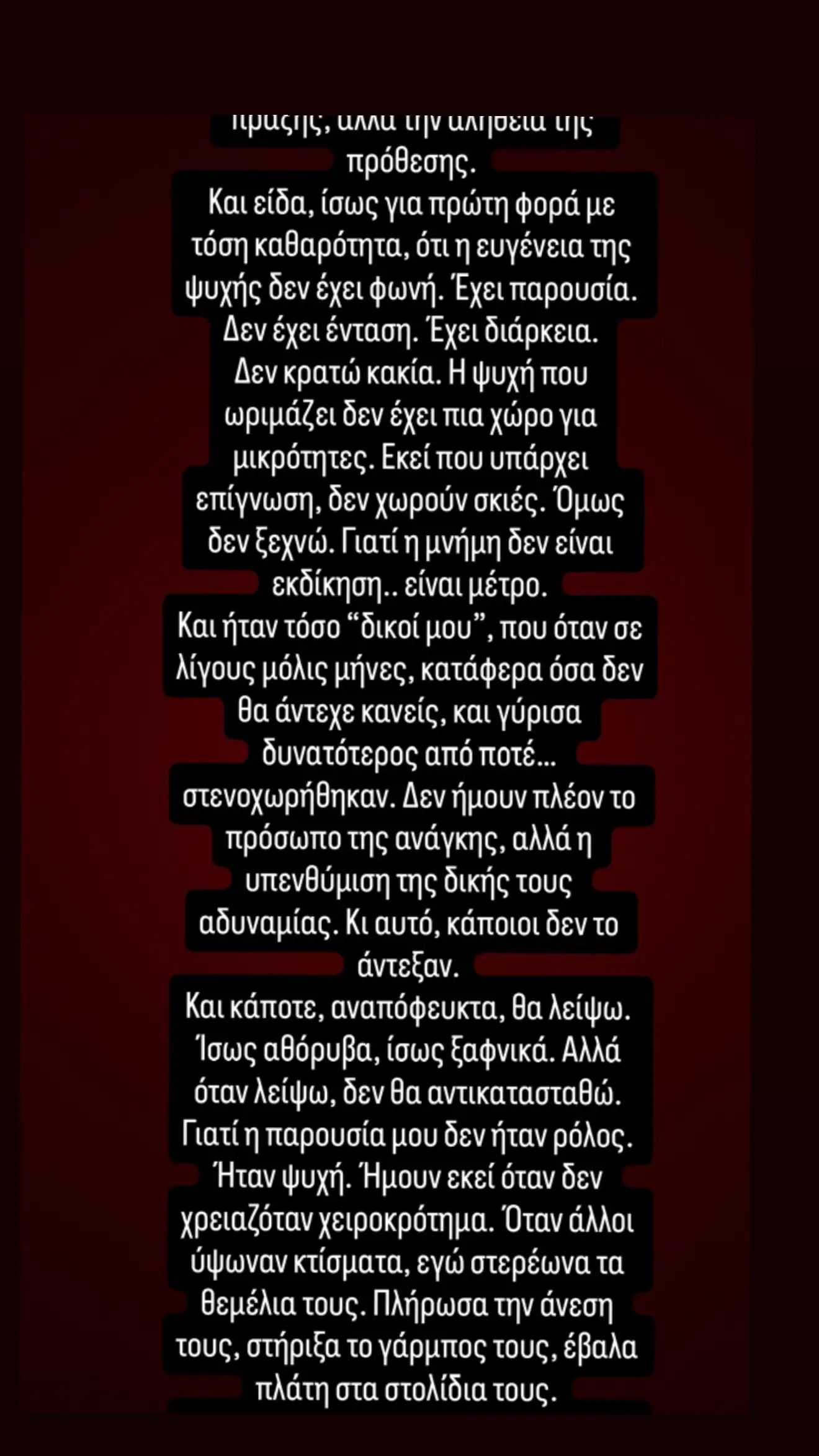 Και πρόσθεσε: «Εκείνη που απλώς αποσύρθηκε, αθόρυβα, σαν να μην υπήρξε ποτέ. Κι όμως, μέσα στα ερείπια των σχέσεων που νόμιζα ακλόνητες στάθηκα. Όχι κραυγάζοντας. Όχι απαιτώντας. Αλλά με καθαρότητα. Με εσωτερική δύναμη. Δεν θριάμβευσα, μα δε λύγισα. Και σε εκείνη την ερημία, φάνηκαν οι πραγματικά σπουδαίοι.