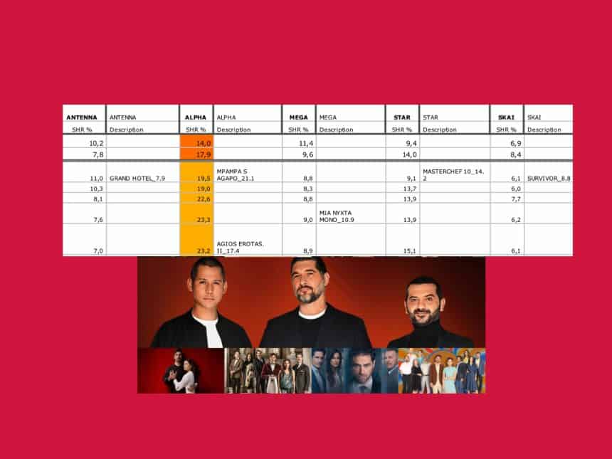 - Το “Μπαμπά σ’ αγαπώ” φέρνει εντυπωσιακές επιδόσεις συνεχίζοντας την προίκα του “Σασμού” και του “Σογιού” στην ζώνη με την μεγαλύτερη πίεση με αποτέλεσμα να εξαϋλώνονται τόσο ο Αντ1 αλλά και ο Σκάϊ.