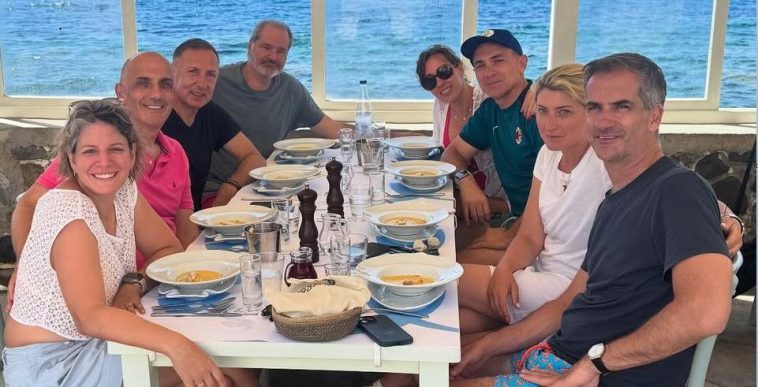 - Στην φωτογραφία που έπεσε τυχαία στα χέρια μας… βλέπετε το ζευγάρι μαζί με την παρέα, τους… ανάμεσά τους ο διευθυντής του Ινστιτούτου Διεθνών Υποθέσεων Κωνσταντίνος Φίλης, αλλά και συνάδελφοι δημοσιογράφοι όπως ο Κωστίδης και άλλοι… απολαμβάνουν το φαγητό τους με θέα τη θάλασσα.