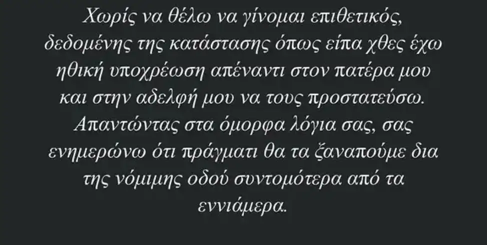 «Αξιότιμε κύριε Γρηγόρη, σας ευχαριστούμε από καρδιάς για τα καλά σας λόγια αυτές τις ημέρες. Φαίνεστε πραγματικά αξιόλογος άνθρωπος. Χωρίς να θέλω να γίνομαι επιθετικός, δεδομένης της κατάστασης όπως είπα χθες, έχω ηθική υποχρέωση απέναντι στον πατέρα μου και στην αδελφή μου να τους προστατεύσω. Απαντώντας στα όμορφα λόγια σας, σας ενημερώνω ότι πράγματι θα τα ξαναπούμε δια της νόμιμης οδού συντομότερα από τα εννιάμερα», έγραψε ο γιος του Αλέξη Κούγια στην ανάρτησή του.