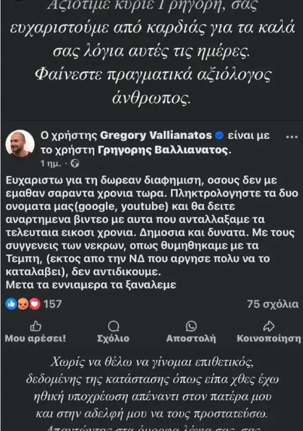 «Αξιότιμε κύριε Γρηγόρη, σας ευχαριστούμε από καρδιάς για τα καλά σας λόγια αυτές τις ημέρες. Φαίνεστε πραγματικά αξιόλογος άνθρωπος. Χωρίς να θέλω να γίνομαι επιθετικός, δεδομένης της κατάστασης όπως είπα χθες, έχω ηθική υποχρέωση απέναντι στον πατέρα μου και στην αδελφή μου να τους προστατεύσω. Απαντώντας στα όμορφα λόγια σας, σας ενημερώνω ότι πράγματι θα τα ξαναπούμε δια της νόμιμης οδού συντομότερα από τα εννιάμερα», έγραψε ο γιος του Αλέξη Κούγια στην ανάρτησή του.