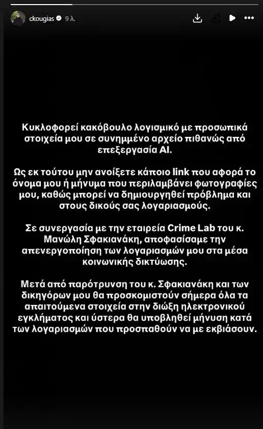 «Κυκλοφορεί κακόβουλο λογισμικό με προσωπικά στοιχεία μου σε συνημμένο αρχείο πιθανώς από επεξεργασία AI. Ως εκ τούτου, μην ανοίξετε κάποιο link που αφορά το όνομά μου ή μήνυμα που περιλαμβάνει φωτογραφίες μου, καθώς μπορεί να δημιουργηθεί πρόβλημα και στους δικούς σας λογαριασμούς», γράφει ο Χρήστος Κούγιας.