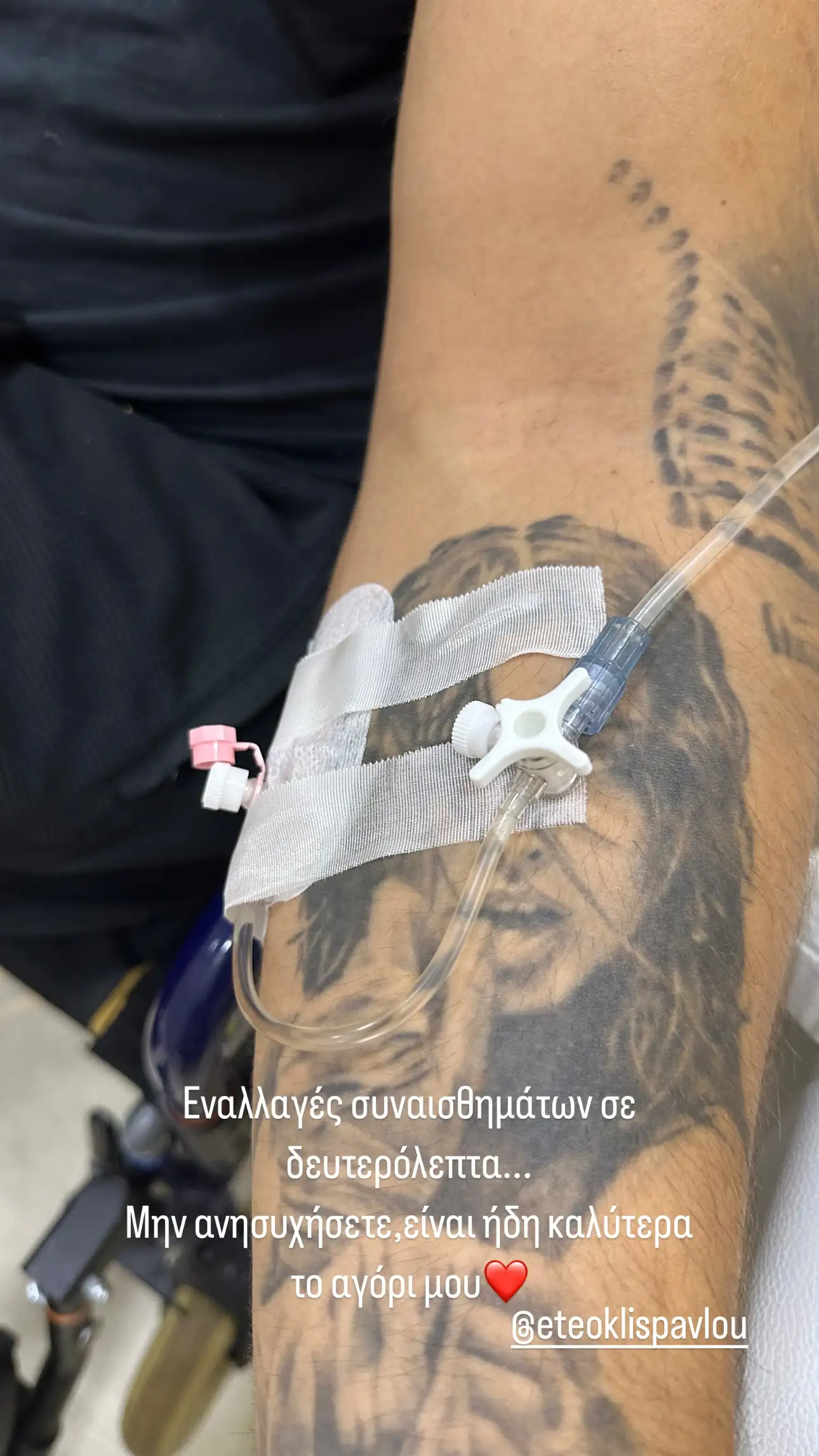 Σε μια άλλη ιστορία, δε, την οποία δημοσίευσε η Ελένη Χατζίδου και αναδημοσίευσε ο σύζυγος της, φαίνεται ο ορός στο χέρι του. «Εναλλαγές συναισθημάτων σε δευτερόλεπτα. Μην ανησυχήσετε, είναι ήδη καλύτερα το αγόρι μου».