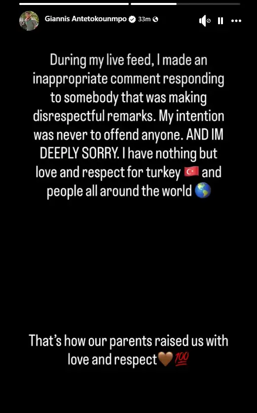 “Κατά τη διάρκεια του live μου, έκανα ένα απρεπές σχόλιο απαντώντας σε κάποιον που μου έκανε προσβλητικές παρατηρήσεις. Η πρόθεσή μου δεν ήταν ποτέ να προσβάλλω κανέναν. Και ζητώ βαθιά συγγνώμη. Έχω μόνο αγάπη και σεβασμό για την Τουρκία και τους ανθρώπους σε όλο τον κόσμο. Έτσι μας μεγάλωσαν οι γονείς μας, με αγάπη και σεβασμό”.