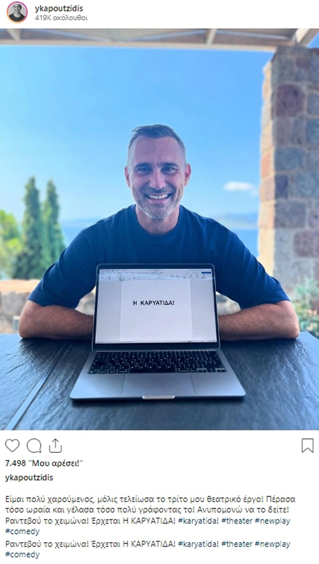 «Είμαι πολύ χαρούμενος, μόλις τελείωσα το τρίτο μου θεατρικό έργο! Πέρασα τόσο ωραία και γέλασα τόσο πολύ γράφοντας το! Ανυπομονώ να το δείτε! Ραντεβού το χειμώνα! Έρχεται Η ΚΑΡΥΑΤΙΔΑ!», έγραψε ο Γιώργος Καπουτζίδης στην ανάρτησή του.