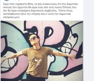 Αυτά είδε και ο Παντελής Καναράκης και κράζει τους μαϊντανούς με το…γάντι «Είμαι στην ευχάριστη θέση, να σας ανακοινώσω ότι στις δημοτικές εκλογές που έρχονται θα είμαι ένας από τους λίγους Έλληνες που δεν θα είμαι υποψήφιος δημοτικούς σύμβουλος. Όποτε όπως καταλαβαίνετε ζητώ την στήριξη σας σ’ αυτή την σημαντική απόφαση μου!”